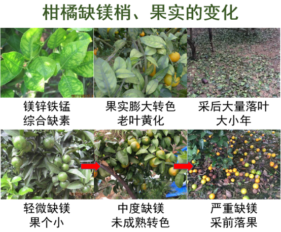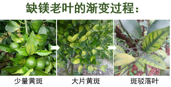 柑橘缺鎂癥狀周年都可發(fā)生,在開(kāi)始結果期和果實(shí)膨大期發(fā)生最多,老葉和果實(shí)附近的葉片首先表現明顯缺鎂癥狀。